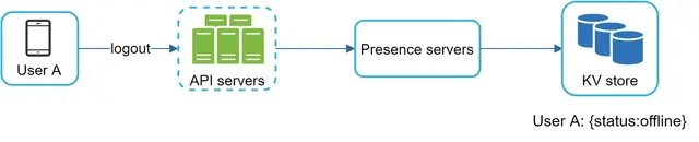 After a WebSocket connection is built between the client and the real-time service, user A’s online status and last_active_at timestamp are saved in the KV store. Presence indicator shows the user is online after she logs in.