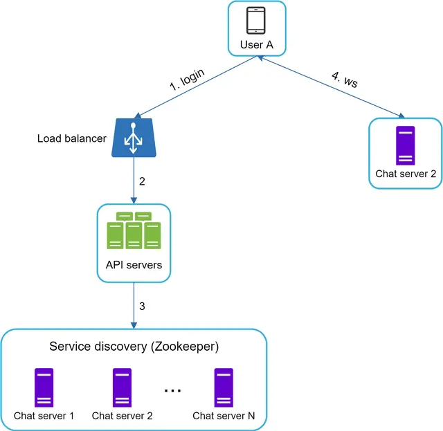 - After the backend authenticates the user, service discovery finds the best chat server for User A. In this example, server 2 is chosen and the server info is returned back to User A.