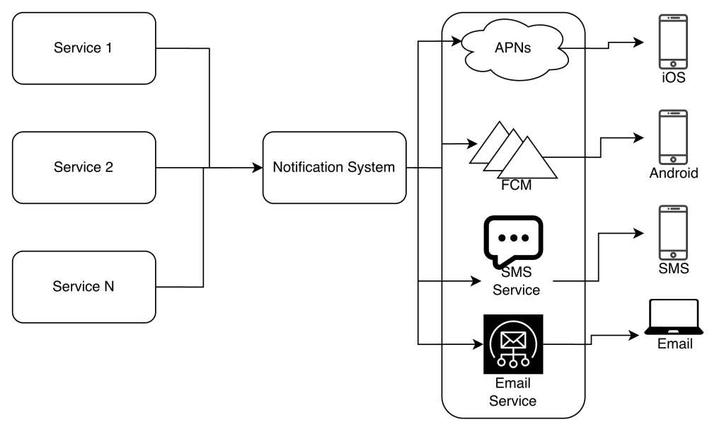Service 1 to N: They represent different services that send notifications via APIs provided by notification servers