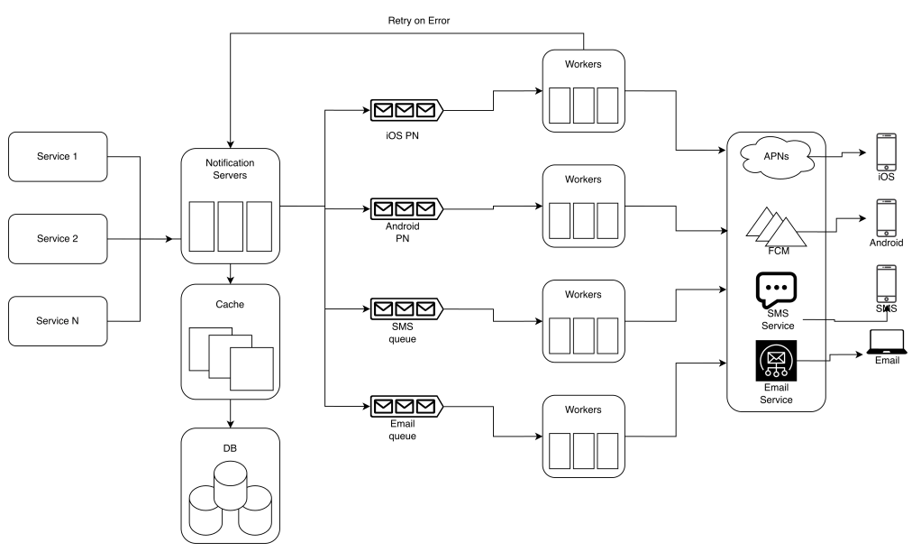 Workers: list of servers that pull notification events from message queue and send them to the corresponding third party services