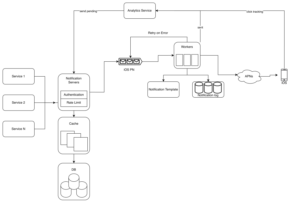 - Notification servers fetch metadata such as user info, device token, and notification setting from the cache or database