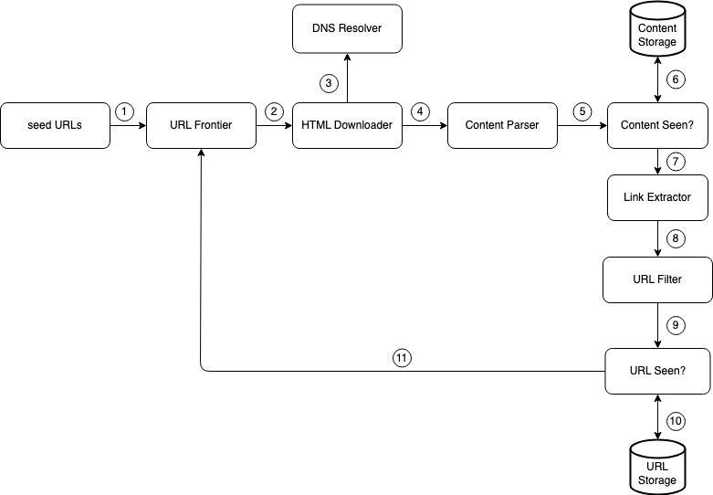 - “URL Seen” component checks if a URL is already in the storage, if yes, it is processed before, and nothing needs to be done.