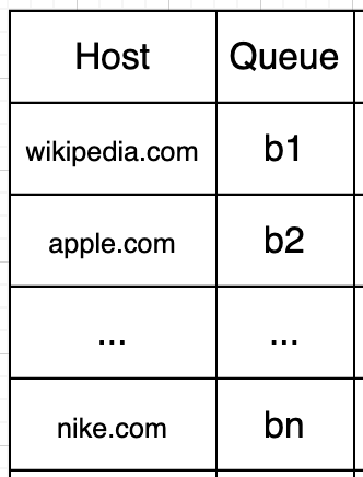 - Queue router: It ensures that each queue (b1, b2, … bn) only contains URLs from the same host.