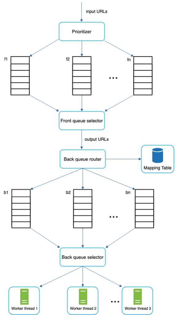 - Queue selector: Each worker thread is mapped to a FIFO queue, and it only downloads URLs from that queue. The queue selection logic is done by the Queue selector.