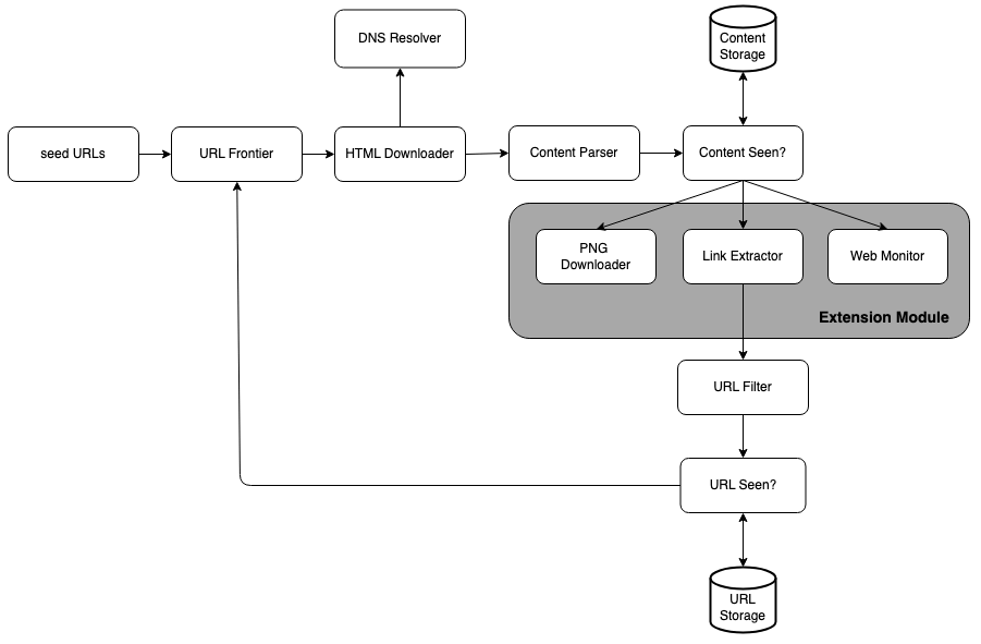 - Extensibility: The system is flexible so that minimal changes are needed to support new content types. If we want to crawl image files in the future, we should not need to redesign the entire system.