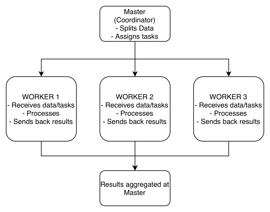 - The master sends the workers data and calculations to run, and they send their results back to the master.